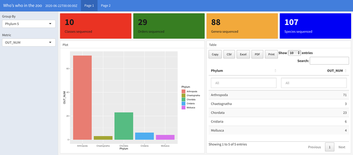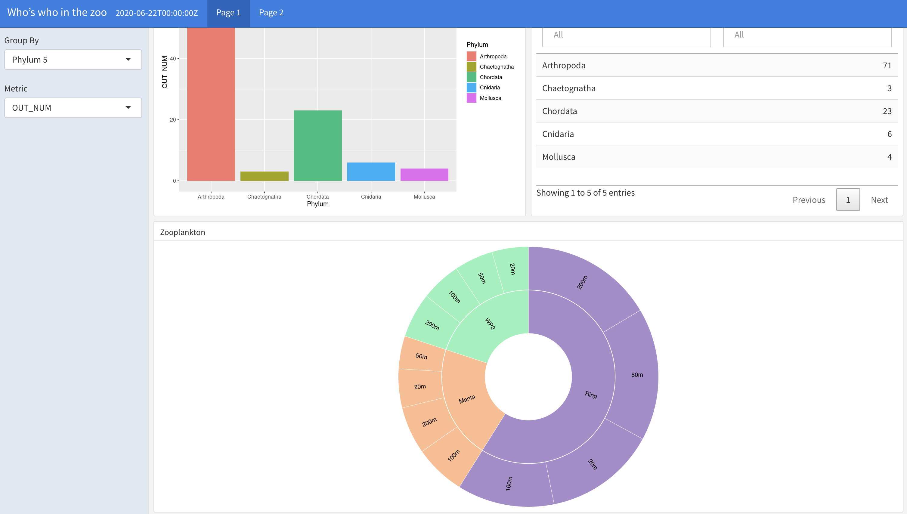 This dashboard showcases the species sequenced using DNA metabarcoding, from Aliwal Shoals and Durban in the Indian Ocean in South Africa. The interactive sunburst diagram allows you to see species assemblages at different depths (20m, 50m, 100m and 200m) and with the different net types used (ring, manta or wp2). You can then drill down from Phylum to Species! See it here in the shiny webapp
