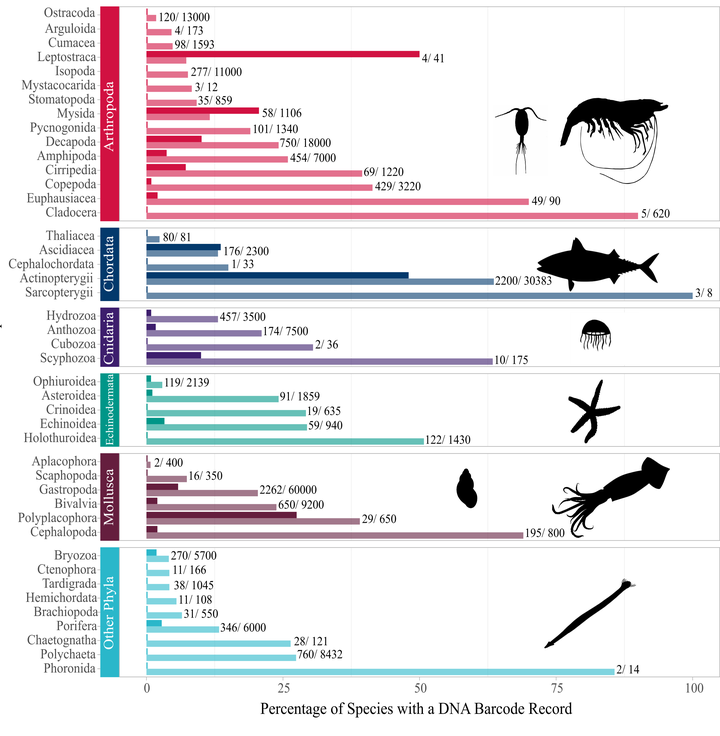 Metabarcoding is an emerging method in which DNA barcoding is combined with next-generation sequencing to determine the biodiversity of taxonomically complex samples. We assessed the current state of DNA barcode reference databases for marine zooplankton in South Africa and undertook a metabarcoding analysis to determine the species composition of samples collected with plankton tow nets. Analysis of DNA sequences mined from the literature and in online barcode reference databases revealed incomplete records for all taxa examined. Barcode records were dominated by meroplanktonic species with commercially important life-history phases (fishes and decapod crustaceans) and by species occurring in easily accessible nearshore habitats. Holoplanktonic species were underrepresented, despite making up the bulk of zooplankton biodiversity, including most potential indicator species. Metabarcoding analysis of plankton samples could identify 45% of amplicon sequence variants to species level based on BOLD databases (123 species) and similar numbers using GenBank and the MIDORI COI classifier. Morphological analysis of samples could not achieve comparable resolution at species level, but with some exceptions it recovered similar classes of organisms to those found by metabarcoding. The need for integrative molecular/morphological studies to increase and validate barcode reference databases of key zooplankton taxa is recognised. Metabarcoding of marine zooplankton in South Africa has now been successfully undertaken and the methodology is expected to facilitate high-resolution monitoring of zooplankton biodiversity in pelagic ecosystems and accelerate the discovery of new species.